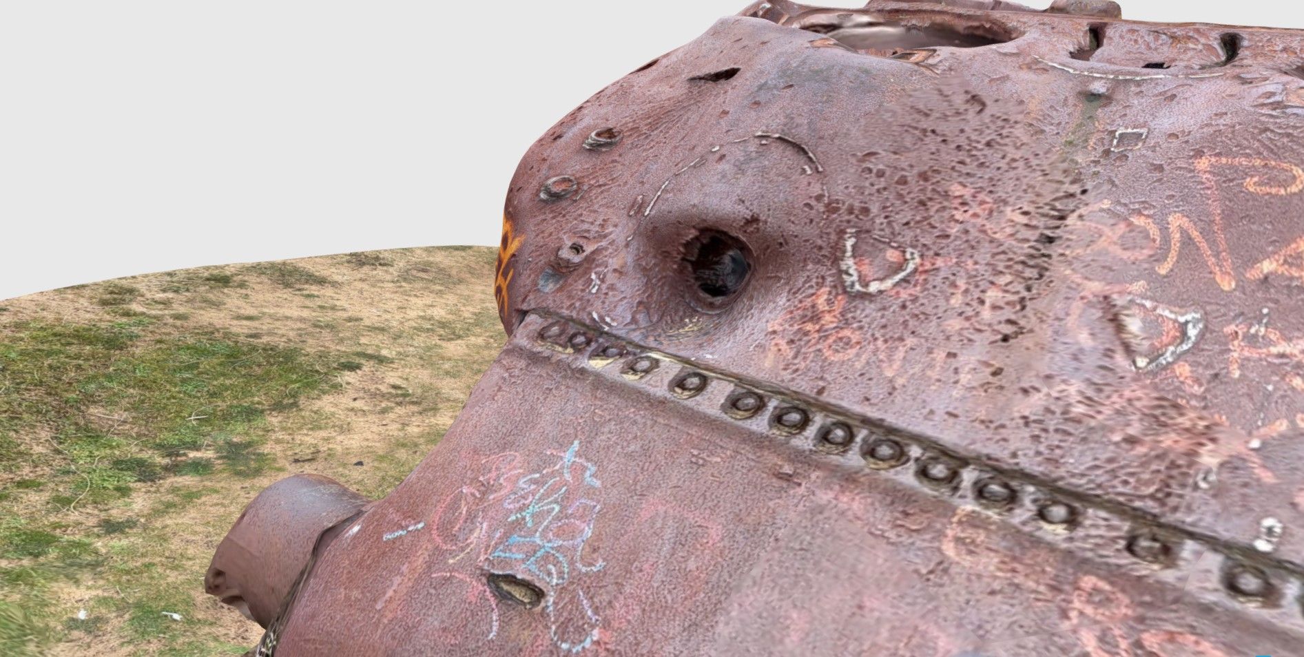 The perfect conditions for scanning are gathered with a partly clouded sky avoiding "hard baked" shadows on the ground and excessive contrast on the object features, such as the partly buried canon gun, the half buried tracks in the sand dune and the rear star-shaped engine.