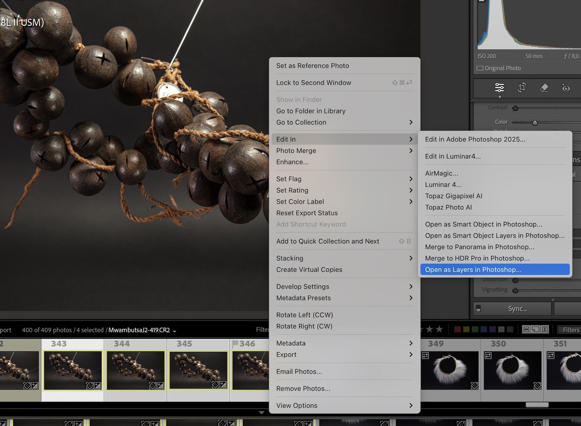 4. Exportation vers Photoshop : Une fois vos images préparées, sélectionnez-les toutes, puis allez dans Photo > Modifier dans > Ouvrir comme calques dans Photoshop. Photoshop prendra le relais pour l'empilement !